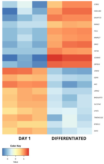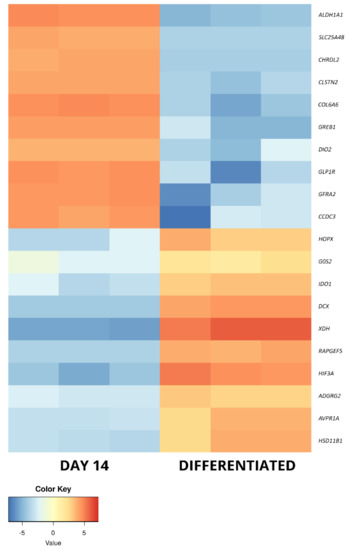 Furthermore, differentially expressed gene (DEG) lists were extracted. For that purpose, fold change (FC) was based on the mean expression values of each gene in the three analyzed sample groups. Furthermore, statistical significance of the results was determined based on the p. value obtained from a Wald test, corrected for multiple comparisons with the use of Benjamini and Hochberg’s false discovery rate. The selection of DEGs was therefore based on FC ≥ 2 and adjusted p value ≤ 0.05. The results of the selection were presented as a volcano plot, on which each point signifies a gene, with the log2 of the fold change and adj. p value presented on the y and x axes, respectively. For the purpose of this study, the 10 most upregulated and downregulated genes between the sample groups (day 14 vs. day 1; differentiated vs. day 1; differentiated vs. day 14) were selected. The expression of the genes of interest was visualized in the form of heatmaps, with the intensity of each sample’s color indicating the extent of the change in expression between sample groups.