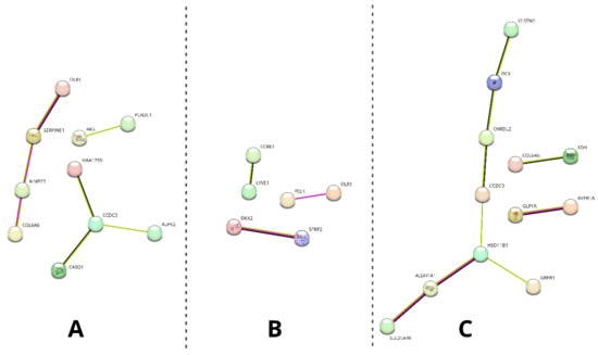 Results of the STRING analysis of predicted interactions between protein products encoded by the differentially analyzed genes of interest. The genes not involved in any interactions were excluded from the figure. (A)—day 14 vs. day 1, (B)—differentiated osteoblast vs. day 1, (C)—differentiated osteoblast vs. day 14. Colors of the edges indicate the source of predicted interaction: magenta—experimentally determined, green—textmining, black—co-expression.