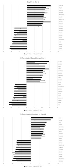 In the current study, the most differentially regulated genes after osteogenic differentiation of ASCs were also investigated. The differentiated osteoblasts were compared to the day 1 control cells, as well as those cultured in vitro for 14 days, in an attempt to correct for the expression changes induced solely by long-term culture. When compared to day 1, 4 out of 10 upregulated genes were associated with an osteoblast phenotype. ZBTB16, DKK2 and HSD11B1 were previously described to take part in osteogenic differentiation, with the last gene of this set also detected in osteoblasts in vivo [52,53,54,55,56]. In turn, SCARA5 activity was previously reported to prevent osteoblast differentiation, suggesting a potential inhibiting response of ASCs to the inducing medium [57]. Four further genes were associated with an MSC-related process but were previously implicated only in the differentiation towards other mesenchymal lineages. FGL1 was found to be upregulated in dental pulp stem cells, as compared to osteoblasts [58]. In turn, GALNT15 was described as upregulated during adipocyte differentiation, while HIF3A and CCBE1 were, respectively, associated with chondrocyte and cardiac phenotypes [59,60,61]. Among the last two of the analyzed most upregulated genes between differentiated osteoblasts and day 1 ASC culture, KANK3 was linked to cancer processes as a tumor suppressor gene, while MMP27 was already detected to be upregulated after long-term in vitro culture, suggesting its overexpression is not directly connected to the differentiation process [62,63].