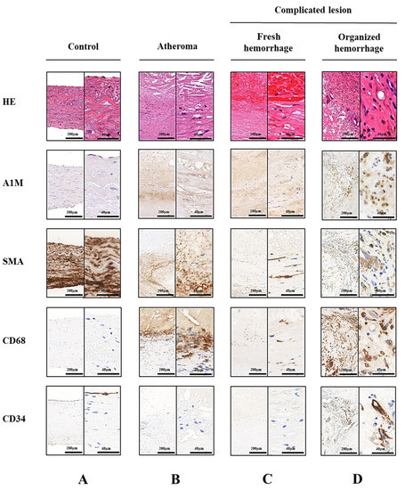 Localization of α1-microglobulin (A1M) in healthy carotid wall, atheromatous plaque and complicated lesion with fresh or organized hemorrhage. Serial sections of healthy carotid wall (Panel (A)), atheromatous plaque (Panel (B)), complicated lesion with fresh (Panel (C)), or organized hemorrhage (Panel (D)) are shown. Smooth muscle cells were identified by smooth muscle α-actin (SMA), macrophages by CD68 and endothelial cells by CD34 stainings. Red blood cells were visualized by hematoxylin-eosin (HE) staining.
