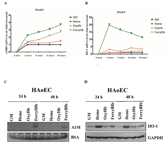 Previous studies have shown that both Oxy- and MetHb induce A1M protein secre-tion in HepG2 hepatoma cells [55]; A1M secretion is also induced by MetHb in U937 histiocytic and K562 erythroid cell lines [55]. Unlike HepG2 hepatoma cells [55], we did not observe that OxyHb induced a considerable A1M mRNA expression in HAoECs and HAoSMCs. However, it did induce an A1M mRNA expression in PBMCs after 24 and 48 h. This might be explained by the data of Schaer, demonstrating that Hb is taken up via the macrophage scavenger receptor CD163 in the absence of Hp [56]. Importantly, we found that FerrylHb induced an A1M mRNA expression more effectively, compared to OxyHb. In the present study, we also followed A1M secretion by immunoblot, which showed that only FerrylHb, but not OxyHb, induced A1M protein secretion to the experimental medium. Another important finding of our study was that FerrylHb, but not OxyHb, induced A1M secretion in HAoECs, HAoSMCs and PBMCs, suggesting a possible unique nature of FerrylHb compared to OxyHb. This could, at least in part, be explained by the transient nature of FerrylHb, which enables it to release its heme moieties [57], acts as a source of free radicals and exhibits a modified globin chain. Although Hb can also be a source of free radicals, the rate of free radical generation from FerrylHb is more prominent. This is, in fact, supported by our recent study demonstrating that FerrylHb, but not OxyHb, inhibits osteoclastic differentiation of macrophages both in vitro and in hemorrhaged atherosclerotic plaques [58], suggesting a unique characteristic of FerrylHb in atherosclerotic plaque development. The contrast between hepatoma cell and vessel wall cells could be explained by the different experimental setups. HepG2 cells, representing a major source of A1M production, secrete a considerable amount of A1M without Hb stimulus [55] compared to our cell cultures. In addition, HepG2 cells were exposed to Hb in serum-free conditions for 1–6 h, while, in our experiments, cells were incubated in the presence of serum (5%) for 24 and 48 h [55]. Another possible explanation could be that oxidation-induced A1M expression is regulated by nuclear factor erythroid 2-related factor 2 (Nrf2) [59,60], the master regulator of antioxidant gene expression, among them, HO-1 [61]. As HO-1 plays an indispensable role to mitigate both Hb- [62] and heme-induced toxicity [63], we postulate that HO-1 activation decreases heme- as well as OxyHb-induced stress levels lowering A1M protein secretion below the detection limit.