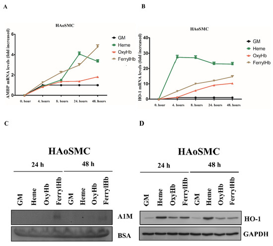 Since A1M positivity was detected in SMCs surrounding the hemorrhage, we examined whether HAoSMCs express A1M in vitro. Similar to endothelial cells, A1M mRNA was significantly induced by both heme and FerrylHb and slightly by OxyHb in a time-dependent manner (Figure 3A).