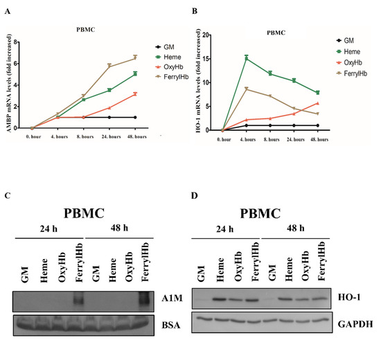 As macrophages showed strong A1M positivity in hemorrhaged atherosclerotic plaques, we examined whether PBMCs express A1M in vitro. We showed that A1M mRNA was strongly induced by heme and FerrylHb and slightly by OxyHb in a time-dependent manner in PBMCs (Figure 4A).