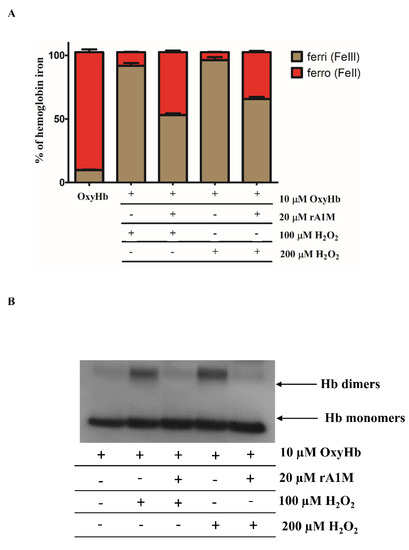 Hb oxidation is implicated in the pathogenesis of atherosclerotic plaque progression [18], as well as in other hemolytic diseases [11,12,13,44]. Having shown that A1M is induced by the Hb oxidation products heme and FerrylHb, we next examined whether A1M inhibits the process of Hb oxidation. Hb (10 µM) was exposed to 100 µM and 200 µM concentrations of H2O2 for 3 h at 37 °C in the presence or absence of rA1M (20 µM). The oxidation process of Hb was followed by measuring the oxidation states of the heme-iron. The quantity of the oxidation forms of iron was determined spectrophotometrically, as summarized in the Methods section. Absorption spectra are added as Supplementary Materials. OxyHb represents ferrousHb which can carry oxygen. H2O2 (100 and 200 µM) catalyzed the rapid oxidation of Hb forming MetHb; the proportion of this oxidized form reached 90% of total Hb (Figure 5A). MetHb formation was markedly inhibited by rA1M displaying a decrease in metHb formation with about 30–40% depending on the H2O2 concentration (Figure 5A). Next, we used immunoblotting to analyze cross-linked Hb as a marker of Hb oxidation. Exposure to H2O2 treatment alone resulted in significant oxidation of Hb reflected by Hb dimer formation that was significantly inhibited by A1M (Figure 5B).