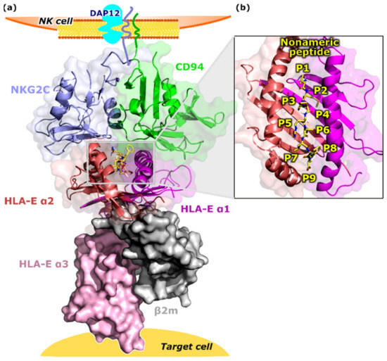 Overview of the HLA-E/peptide/β2m/NKG2C/CD94 immune complex assembled on the surfaces of NK and target cells. (a) The multicomponent complex was comprised of a HLA-E heavy chain divided into three alpha domains (α1–α3), HLA-E light chain β2m, nonameric peptide, CD94 and NKG2C proteins (magenta, salmon, and pink, grey, yellow, green, and blue, respectively). CD94 and NKG2C transmembrane regions and DAP12 protein are only schematically presented. (b) Magnified binding pocket of the nonameric peptide located between the HLA-E α1 and α2 domains. HLA-E—HLA class I histocompatibility antigen, alpha chain E, β2m—Beta-2-microglobulin, NKG2C—NKG2-C type II integral membrane protein, CD94—Natural killer cells antigen CD94, NK cell—Natural killer cell, DAP12—DNAX activation protein of 12kDa.