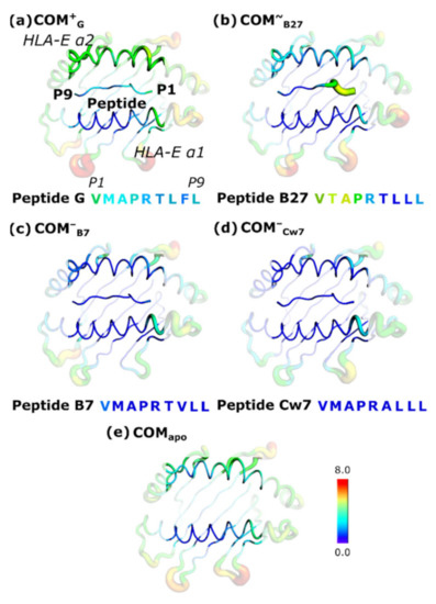 B-factor representation of the atomic Root Mean Square Fluctuations (RMSF) of the HLA-E α1 and α2 domains, and the bound peptide. (a) COM+G, (b) COM~B27, (c) COM-B7, (d) COM-Cw7, and (e) COMapo. The peptide sequences in one letter code are colored according to the corresponding B-factor. The parts of HLA-Eα1 and HLA-Eα2 domains that are not in the vicinity of the peptide and receptor proteins are shaded. HLA-E—HLA class I histocompatibility antigen, alpha chain E.