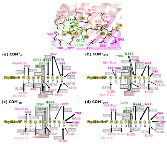 Schematic summary of the bound peptide interacting residues with HLA-Eα1, HLA-Eα2 and CD94 proteins for the models (a) COM+G, (b) COM~B27, (c) COM−B7, and (d) COM−Cw7. Only hydrogen (H) bonds with occurrences higher than 10% are depicted. The arrows point in the direction of residues acting as H-bond acceptors. The arrow line thickness represents the H-bond frequencies (stated in the brackets), where the thickest line represents the highest frequency. HLA-E—HLA class I histocompatibility antigen, alpha chain E.