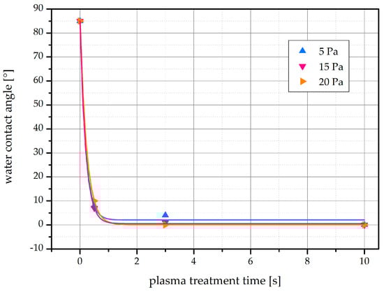 WCA on the surface of bean seeds immediately plasma treatment. Recorded after different plasma treatment times (0–10 s) using different gas pressures (5–20 Pa). Exponential curves were fitted to the data.