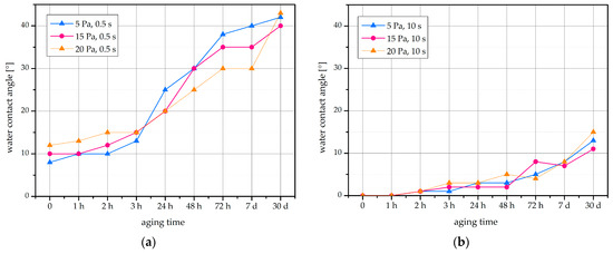 Hydrophobic recovery of the WCA on the surface of bean seeds. Recorded after plasma treatment for (a) 0.5 s or (b) 10 s at different gas pressures (5–20 Pa), followed by different times of ageing in ambient air conditions.