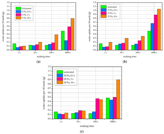 Water uptake of native and plasma-treated bean seeds expressed as g of water per 10 seeds soaked for different times (1–1000 s). Seeds were treated at (a) 5 Pa, (b) 15 Pa, and (c) 20 Pa.