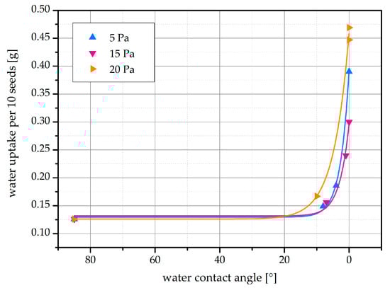 With soaking experiments, the link between wettability and WU increase has been previously demonstrated for beans after IC RF plasma treatment. In the two studies involving beans as well as lentils and wheat, Bormashenko et al. concluded that cold radiofrequency air plasma treatment leads to the dramatic decrease in the WCA of seeds, which in turns results in increased WU [15,16]. Further, the accumulation of increased amounts of water has been demonstrated in bean seeds by magnetic resonance imaging (MRI) following treatment with a helium plasma jet [36] and even simply after exposure to a plasma ball [37]. The correlation between WCA and WU in our own results is shown in Figure 6. The WU appears to increase exponentially with decreasing WCA. The three curves for seeds treated at different pressures nearly overlap.