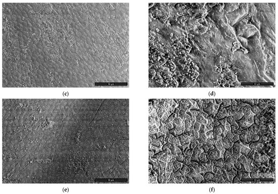 SEM images of bean surface at selected treatment conditions: (a,b) untreated; (c,d) p = 5 Pa, t = 3 s; (e,f) p = 20 Pa, t = 3 s. (a,c,e) 2000× magnification; (b,d,f) 10,000× magnification.