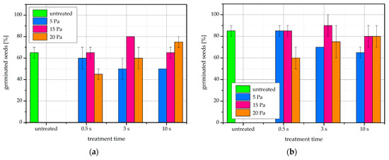 Within the incubation times and sample sizes used in our experiment, no notable increases in the germination percentage were recorded, as shown in Figure 8. No trends with gas pressure or treatment time were apparent. At certain treatment conditions, fewer seeds than in the untreated control germinated.