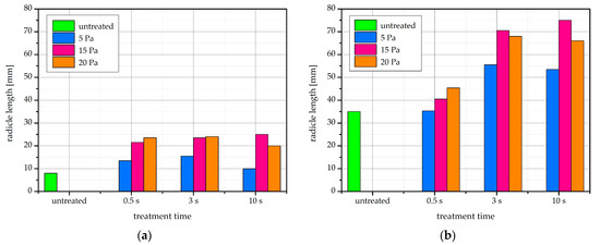 Out of the publications that have so far followed the germination percentage of bean seeds after plasma treatment, the parameter was increased by one treatment, namely an IC RF air plasma [15]. In three other cases, similarly to our results, the germination percentage was unchanged. In the case of treatment with an argon plasma jet, germination was already 100% in untreated seeds [17]. In another treatment with an IC RF air plasma [16], as well as in a seed-packed DBD reactor with helium [18], germination of untreated seeds was also >90%, and the plasma treatment accelerated the germination in both cases. Germination percentage was increased by plasma treatment in other legume species such as lentil [15], mung bean [29], pea [21], and soybean [13]. Interestingly, an early paper achieved a significant improvement in germination simply with an electrostatic treatment using a high-intensity electric field, but it does mention partial discharges between seeds, so the effect may be plasma-related [52]. If plasma treatments of seeds use power or duration that is too high, they can damage the delicate seed material [8,14,53], as the reactive species dose received by the seed is too high. It is possible that this occurred at some of the treatment conditions used in our experiments, but no correlation with treatment time nor with gas pressure is evident in Figure 8.