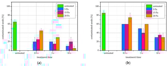 Results in the literature show that plasma can successfully decontaminate seeds of legumes. Bean seed decontamination has been shown in an oxygen DBD setup, where the plasma has completely inactivated the pathogens, and no fungal growth was observed in the culture. However, this occurred at treatment times already detrimental to germination [14]. In soybean infected with the seed-borne Diaporthe/Phomopsis fungal complex, DBD treatment significantly reduced the percentage of infected seeds, but the result depended on the treatment gas, time, and the dielectric material of the plasma system [13]. A surface DBD system also caused significant reductions of contamination on lentil seeds previously inoculated with fungal spores, determined using the plate count method [59]. Furthermore, on pea seeds treated with a gliding arc jet, a 60 s treatment caused a significant reduction of the microbial count [39].