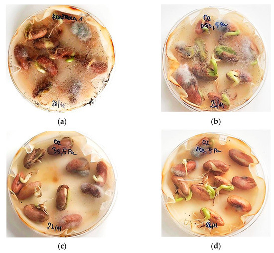Bean seeds incubated at germination conditions after 7 days. Sprout and root growth are visible, as well as the presence of fungal contamination. (a) Untreated; (b) p = 5 Pa, t = 0.5 s; (c) p = 5 Pa, t = 3 s; (d) p = 5 Pa, t = 10 s.