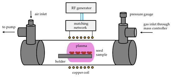 The reactor used for the treatment of bean seeds was an in-house, pilot-scale plasma system operating in the pressure range between about 1 and 100 Pa. Plasma was inductively coupled with an RF generator via a coil and a matching network optimized for the IC plasma in the H-mode. The glass tube of the reactor, in which seed samples are treated, was 800 mm in length and 36 mm inner diameter. The reactor was continuously pumped using a two-stage oil rotary vacuum pump with a nominal pumping speed of 80 m3/h. The pump was connected to the reactor on one end through a series of stainless steel tees, onto which a simple air inlet valve was mounted for venting the whole vacuum system. To achieve the desired gas pressure, commercially available oxygen of 99.99% purity was introduced at the opposite end of the tube by a flow controller AERA FC7700 (Advanced Energy, Fort Collins, CO, USA) calibrated for argon at 20 °C. The gas inlet was also connected to the reactor through a series of stainless steel tees, onto which a Baratron absolute pressure gauge (MKS Instruments, Andover, MA, USA) was mounted to monitor the pressure inside the reactor. A six-turn water-cooled copper coil with a length of 70 mm was wrapped around the tube, and a Cesar 1310 RF power generator (Advanced Energy, Fort Collins, CO, USA) operating at 13.56 MHz was coupled to the coil via a matching network. The generator operates at an adjustable output power of up to about 1 kW, but the experiments were performed at a fixed output power of 400 W. A schematic representation of the system is seen in Figure 13.