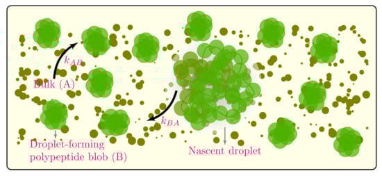 We consider the intracellular space as a metastable poor solvent continuum fluid made up of droplet-forming polypeptide blobs (component B) and all other molecules making up the cyto- or nucleoplasm, the bulk (component A), as shown in Figure 1. The polypeptides are assumed to be under local thermal equilibrium such that blob–solvent interactions result in the proteins taking globular conformations. At critical concentrations of the macromolecules, the polypeptide blobs go through a phase separation process whereby blobs aggregate into droplets with the blobs leaving the bulk at a rate and disassociating from the droplet at a rate of . We define the spatiotemporal protein volume fraction (order parameter) at position and time t as , where and are, respectively, the volume fractions of bulk molecules and droplet-forming polypeptide blobs. We assume that the fluid is incompressible such that . In the following analysis, we present the phase separation dynamics of the field variable , taking into consideration biologically relevant parameters such as the effects of reaction rates and and experimentally verified macromolecular crowding dynamics.
