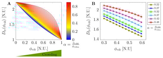 Dependence of tracer diffusion coefficient () on macromolecular crowder concentration : (A) effective concentration-dependent tracer diffusion coefficient for several values of ; (B) dependency of on crowder concentration for selected values of ribosome crowder concentration and control parameter in the range of in human cells (HEK293) as experimentally reported in [56].