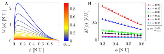 Figure 3 shows the plot of the mobility coefficient against the volume fraction for several values of macromolecular crowder concentration. As can be noted in Figure 3A, at very high crowder concentration (), the mobility is very low and almost constant for changes in volume fraction of phase separating molecules. The mobility sharply increases for a small change in volume fraction, particularly at a low crowder concentration. Figure 3B shows changes in mobility at low crowder concentration (solid lines) and high concentration (marks) for various control parameters in the experimental range from to . As can be seen, this range of control parameter () has little effect on the mobility. This can be attributed to the observation that is far from the grass transition value of the intracellular space where would be [56]. In other words, under normal physiological conditions, the cyto-/nucleoplasm is far from glass transition.