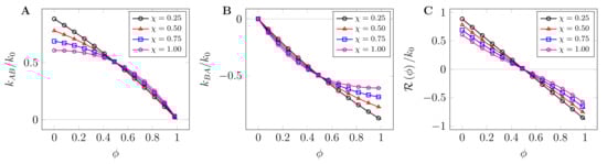 Figure 4 shows plots for relative reaction rates (A) and (B) as a function of volume fraction for several values of the interaction parameter . As can be noted, decreases with increasing volume fraction due to decreased mobility. Intriguingly, the degeneracy of the reverse reaction rate levels off at high volume fractions. This can be attributed to the observation that at low bulk protein concentrations, droplet-forming polypeptide blobs may easily diffuse out of the nascent droplet, thereby effectively disassembling it. In other words, due to the competing nature of the reactions, the rate should quickly level off at high volume fraction and interaction rate. At a physicochemical level, this agrees with the observation that state-dependent reactions reduce chemical interconversion (dimers to monomers) inside a protein cluster, despite the dimer density being much higher inside the cluster than in the bulk [53]. When the chemical potential difference between the interconverting chemicals reduces to zero, the overall reaction rate is zero, thereby effectively forming stable droplets, Figure 4C.