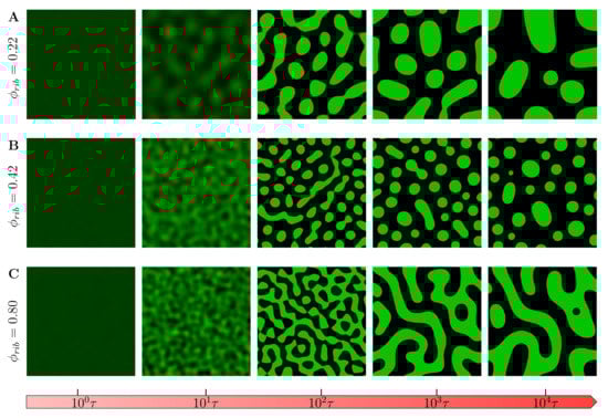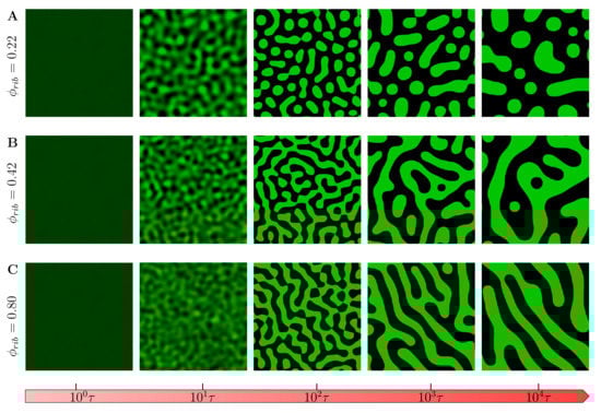 We first studied the evolution of phase-separated morphology without chemical reactions. Figure 5 shows the evolution of the field variable with the chemical reaction rate set to zero () from the same initial conditions () under different crowder concentrations. We observe that at very low crowder concentrations (Figure 5A), the late stage () coarsened morphologies are on average round droplets as is usually observed in in vitro experiments. However, an increase in crowder concentration results in smaller droplets coarsened at late stage (Figure 5B) (see Supplementary Materials Videos S1 and S2). This can generally be attributed to the reduced mobility of droplet-forming polypeptides diffused in the overcrowded environment. This observation has also been more recently experimentally verified in peptide/oligonucleotide complexes [73]. Any further increase in the crowder concentration results in the phase-separated morphologies taking labyrinthine patterns with a smaller characteristic wavelength reminiscent of arrested gel-like phases (Figure 5C).