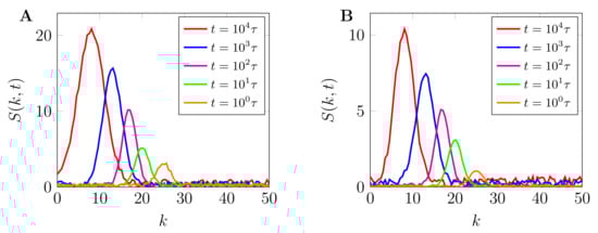 Figure 7 shows the plot of spherically averaged structure factor , both with and without chemical reactions (Figure 7A,B, respectively) plotted against the wave number, . As can be observed, the structure functions reveal several controllable characteristic length scales that emerge from the fast and slow coarsening of phase-separated patterns. During the early stage of phase separation, both structure function grows exponentially, signifying the quick nucleation and growth of phase-separated morphologies due to the fast mobility in the low macromolecular crowders regime. The inclusion of chemical reactions reduces the peaks of the structure function which eventually leads to the arrested coarsening and formation of labyrinthine morphologies as observed in late stages of Figure 6C. This is further discussed in Section 3.2.