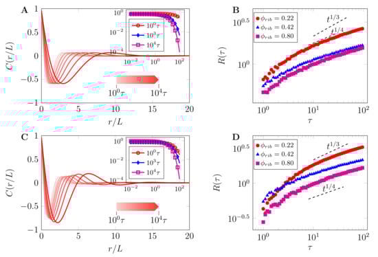 Normalized correlation functions () and dominant characteristic length-scales (): (A) correlation function for morphology in Figure 5A, without reactions, that is, and (B) corresponding dominant length-scale for different crowder concentrations. (C) Correlation function for morphology in Figure 6A, with reactions, that is, and (D) corresponding dominant length-scale for different crowder concentrations. As can be noted in both (B,D), the exponent for early nucleation and growth is predominately higher than that for late stage-coarsening towards steady state regimes, . For the same value of crowder concentration, the growth and coarsening rates are increased when reactions are included, as can be concluded from both late modes of the correlation functions and late-stage dominant characteristic length-scales. Insert: Log–log plots of the same quantities to illustrate scaling for selected times.