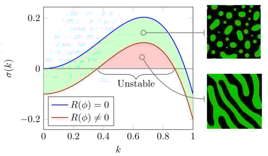 We now study the effects of chemical reactions on the coarsening of final morphologies at high macromolecular crowding. This was performed by analyzing the dispersion characteristics of the dynamics (13) with and without chemical kinetics. If Equation (13) is linearized around the initial average value of the field variable and Fourier transform, we obtain the growth rate of small perturbations as , where [67]. As can be observed from Figure 9, the inclusion of chemical reactions can result in unstable wave vectors () that are independent of domain size. These independent states may lead to domain-coarsening arrest, resulting in the phase-separated morphologies changing from droplets to labyrinthine patterns as shown in Figure 9. Biochemically, the range of parameters k may be tuned by both the chemical reactions and the presence of macromolecular crowders. This phase transition is consistent with in vitro experiments where it has been shown that crowder-mediated depletion interactions alter the liquid-like features of condensates to viscoelastic gel-like state [37,59,75].