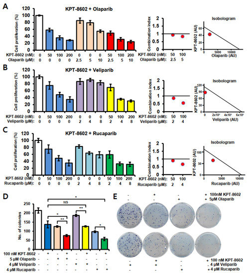 KPT-8602 with PARP inhibitors induced growth inhibition of 22rv1 prostate cancer cells. (A–C) 22rv1 cells were treated with 50–200 nM doses of KPT-8602 or 2–10 µM doses of olaparib, veliparib and rucaparib for 72 h. MTT assay was performed to determine the growth inhibition. Left panel is the growth inhibition bar diagram with single or combinations of KPT-8602 and PARP inhibitors. Middle and right panels are the corresponding combination indexes and isobolograms of A–C, respectively, which were generated using Calcusyn 2.1 software. (D–E) Colony formation with single or combinations of KPT-8602 and PARP inhibitors. D. Bar diagram showing the number of colonies with indicated doses of KPT-8602 or PARP inhibitors. E. Representative plates showing colonies with either alone or a combination of KPT-8602 and PARP inhibitors. All experiments have been done at least thrice. Error bars represent standard deviation. NS, not significant; * p < 0.05; ** p < 0.01.