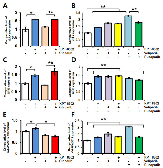 Expression of apoptosis-associated genes in response to KPT-8602 and PARP inhibitors treatment in 22rv1 cells. Gene expression was determined after 24 h of treatment using real-time RT-qPCR. (A,B) mRNA expression of BAX; (C,D) mRNA expression of TP53 and (E,F) mRNA expression of CASPASE 9. All experiments have been done at least three times. Error bars represent standard deviation. * p < 0.05; ** p < 0.01.