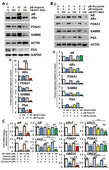 The basal expression level of AR protein is very low in 22rv1 cells. Olaparib at 10 µM dose was shown to induce AR expression when used alone, but not in combination with KPT-8602 (Figure 4A(i,ii)). All of the PARP inhibitors showed downregulation of the AR variant (ARv) in combination with KPT-8602. FOXA1 was downregulated by both KPT-8602 and PARP inhibitors treatment either alone or in combination. AR signaling-associated protein SAM68 has been shown to be involved in a variety of cellular processes including alternative splicing and migration potential in various types of cancer [29,30]. We observed decreased expression of SAM68 in combination treatment (Figure 4A,B). A similar trend was also found in the case of prostate-specific antigen (PSA) (Figure 4A,B).