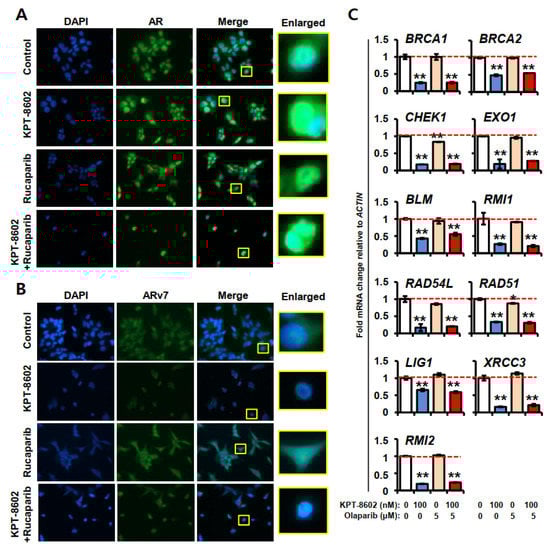 AR and ARv7 localization and DNA damage response of prostate cancer cells under KPT-8602 and PARP inhibitors treatment. (A,B) Immunofluorescence (IF) analysis of AR and ARv7 in 22rv1 cells. Cells were grown in cell culture-treated chamber slides and treated with 2 µM dose of KPT-8602 and 10 µM dose of rucaparib alone or in combination. After 24h cells were fixed, permeabilized and stained with 1:600 and 1:100 dilution of AR and ARv7 (green) antibodies, respectively. Nuclei were stained with DAPI (blue). (C) Gene expression was determined after 24 h of treatment using real-time RT-qPCR. mRNA expressions of BRCA1, BRCA2, CHEK1, EXO1, BLM, RMI1, RAD54L, RAD51, LIG1, XRCC3 and RMI2 in KPT-8602 and/or olaparib treated cells. Red dotted line indicates the expression level of the control. Doses for KPT-8602 and olaparib were 100 nM and 5 µM, respectively. Experiments have been done in triplicate. Error bars represent standard deviation. * p < 0.05; ** p < 0.01.