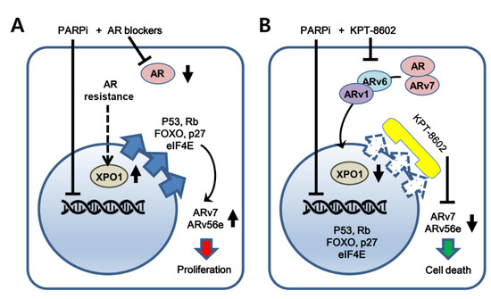 Schematic diagram illustrating the working hypothesis for the sensitization of mCRPC cells to XPO1 and PARP inhibitors. (A) Mechanism of drug resistance with traditional PARP inhibitor and AR-targeted agent treatment. (B) Sensitization of mCRPC cells using second generation SINE compound KPT-8602 and PARP inhibitors. BRCA1/2 deficient mCRPC growth cannot be sufficiently blocked by PARP inhibitors and AR blockers since the tumor suppressor proteins (TSPs) are functionally inactivated due to their excessive export to the cytoplasm. KPT-8602 can retain TSPs such as TP53, RB, FOXO, P27 and AR translation promoter eIF4e in the nucleus to facilitate the induction of cell death signals. Moreover, by keeping AR and ARv7 in the nucleus, KPT-8602 interrupts AR- and ARv7-mediated import of ARv1 and ARv6 in the nucleus.