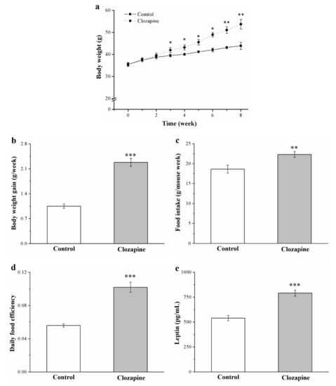 (a) Change in body weight, (b) weekly weight gain per mouse, (c) weekly food intake per mouse, (d) daily food efficiency, and (e) serum leptin level in clozapine group (receiving 2 mg/kg/day) and control group for 8-week experimental period. Data are mean ± standard deviation (n = 10). * p < 0.05, ** p < 0.01, *** p < 0.001.