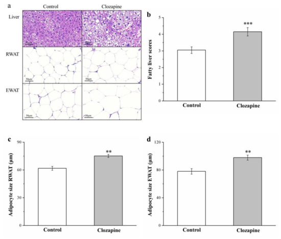 (a) Hematoxylin and eosin (H&E)-stained sections of liver, EWAT, and RWAT tissues (magnification, 200×); (b) fatty liver score; and size of (c) RWAT and (d) EWAT adipocytes for clozapine (receiving 2 mg/kg/day) and control groups. Data are mean ± standard deviation (n = 10). ** p < 0.01, *** p < 0.001.