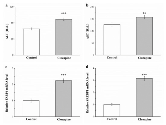 Clozapine influenced hepatic function, including serum aspartate aminotransferase (AST) and alanine aminotransferase (ALT) levels. The ALT and AST levels of the clozapine group were 1.2 and 1.4 times those of the control group, respectively (as illustrated in Figure 4a,b). In humans and rats, fatty liver disease is promoted by sterol regulatory element–binding protein 1 (SREBP1) and fatty acid-binding protein 4 (FABP4) [34,36]. Significantly higher FABP4 and SREBP1 mRNA levels (2.2- and 3.2-fold higher, respectively; Figure 4c,d) were discovered in our clozapine group. The significant increases in AST and ALT levels were engendered by the genetic activation of hepatic steatosis; this may be because of the mediating effect of increased mRNA expression of fat-accumulation-related molecular mechanisms in the liver.