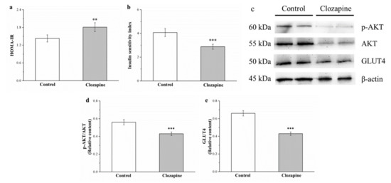 The homeostatic model assessment for insulin resistance (HOMA-IR) and IS indices were employed to evaluate insulin resistance (IR) and IS, respectively [40], which were discovered to be 127% higher and 30% lower, respectively, in the clozapine group (as illustrated in Figure 7a,b). How clozapine affected insulin signaling in muscles was investigated (as illustrated in Figure 7c), and the results revealed that clozapine treatment engendered a reduction in Akt activation and glucose transporter 4 (GLUT4) expression (23% and 35% lower in the clozapine group, respectively; as illustrated in Figure 7d,e).