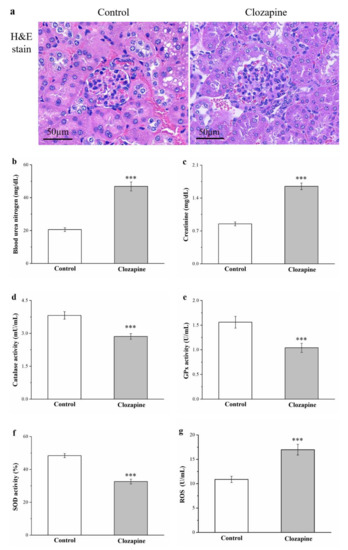 Because renal injury is likely to develop in individuals with diabetes, hyperlipidemia, and obesity, we investigated whether clozapine engenders kidney damage [41]. H&E staining revealed that clozapine induced glomerulonephritis that involved inflammatory cell infiltration (as illustrated in Figure 8a). Additionally, the clozapine group had significantly higher serum levels of creatinine and blood urea nitrogen (BUN; 2.3- and 2.0-fold higher, respectively; Figure 8b,c). The development of renal damage is related to the kidneys containing fewer antioxidant enzymes; such deceased antioxidant activity may cause necrosis and impaired renal function [42]. Compared with that of the control group, the clozapine group exhibited 25%, 33%, and 23% smaller amounts of the antioxidant biomarkers catalase (as illustrated in Figure 8d), glutathione peroxidase (GPx; as illustrated in Figure 8e), and superoxide dismutase (SOD; as illustrated in Figure 8f), respectively. Moreover, the kidneys of the clozapine group contained 1.6 times more reactive oxygen species (ROS; as illustrated in Figure 8g).