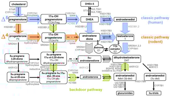 Summary of the principal gonadal steroidogenic pathways. Steroid precursors and metabolites from the classic delta 4 (orange arrows) and delta 5 pathways (blue arrows) are shown together with the backdoor (alternative) pathway (green arrows).