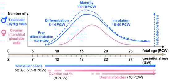 The dynamic progression of steroidogenic cell populations in the human fetal testes and ovaries. Profiles of the numbers of steroidogenic testicular Leydig cells (blue line) and ovarian interstitial glandular cells (pink lines) are depicted in comparison with the differentiation of testicular and ovarian cords, respectively, and of testosterone circulating profiles (adapted from [,,,,]). Post-conception week (PCW); Gestational week (GW); and days post conception (dpc).