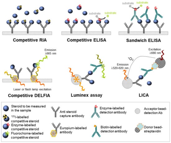 A schematic explanation of the principal immunological assay types. All the immunological methods represented here rely on the use of a steroid-directed specific detection antibody fixed on a solid phase or on beads. The main difference lies in the detection technique. The steroid of interest-antibody complex will be detected even by a radioactive competitor (radioimmunoassay; RIA), or an enzymatic reaction (Enzyme Linked ImmunoSorbent Assay; ELISA), fluorescent dyes (Dissociation-enhanced lanthanide fluorescence immunoassay; DELFIA, Luminex technology), or chemiluminescent dyes (light-initiated chemiluminescent assays; LICA). The main components for each technology are described in the box.