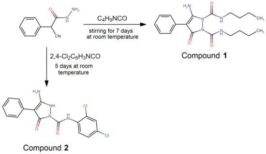 - Kaczor, A.A.; Wrobel, T.; Karczmarzyk, Z.; Wysocki, W.; Fruzinski, A.; Brodacka, M.; Matosiuk, D.; Pitucha, M. Structural studies on N-(1-naphthyl)-3-amino-5-oxo-4-phenyl-1hpyrazole-1-carboxamide with antibacterial activity. Lett. Organ. Chem. 2014, 11, 40–44. [Google Scholar] [CrossRef]
