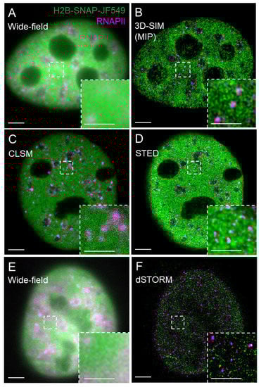 Visual comparison of SIM, STED, and dSTORM. Nuclei of U-2 OS cells expressing histone H2B tagged with SNAP-tag were labeled with the JF549 SNAP substrate (H2B-SNAP-JF549, green), chemically fixed, and indirectly immunolabeled against RNAPII with a secondary antibody conjugated with Alexa Fluor 647 (magenta, Abberior STAR 635P for STED). The same cell was imaged by (A) wide-field and (B) 3D-SIM (MIP—maximum intensity projection of a 3D-SIM z-stack); (C) confocal laser scanning microscopy (CLSM) and (D) STED microscopy followed by deconvolution; (E) wide-field and (F) 2D dSTORM. Construct H2B-Halo-SNAP and Janelia Fluor (JF)549 SNAP tag substrate were kind gifts of Xavier Darzacq from UC Berkeley and Luke Lavis from Janelia Research Campus of the Howard Hughes Medical Institute, respectively. Bar = 5 µm; inset 1 µm.