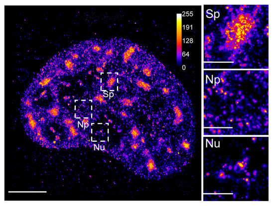 3D dSTORM imaging of nuclear phosphatidylinositol 4,5-bisphosphate. A 2D projection of the 3D dSTORM image of the nuclear phosphatidylinositol 4,5-bisphosphate (PIP2) indirectly immunolabeled by primary anti-PIP2 antibody followed by secondary antibody conjugated with Alexa Fluor 647 and imaged by 3D dSTORM. Selected regions show specific pattern of PIP2 associated with nuclear speckles (Sp), nucleoplasm (Np) and nucleolus (Nu). Calibration bar shows relative fluorescence intensities. Scale bar = 5 µm; inset 1 µm.