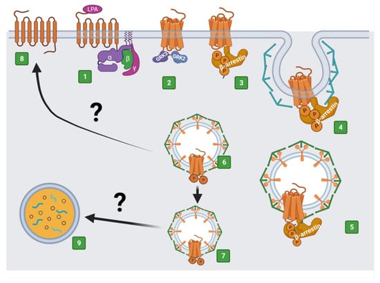- Alcántara-Hernández, R.; Hernández-Méndez, A.; Campos-Martínez, G.A.; Meizoso-Huesca, A.; García-Sáinz, J.A. Phosphorylation and Internalization of Lysophosphatidic Acid Receptors LPA1, LPA2, and LPA3. PLoS ONE 2015, 10, e0140583. [Google Scholar] [CrossRef]