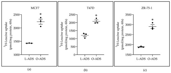 The kinetic study showed that O-ADS stimulates LAT1-mediated uptake of physiologically relevant concentrations of leucine (Figure 3). The greatest fold increase in leucine uptake by LAT1 in response to O- compared to L-ADS occurred at leucine concentrations between 10 and 200 µM (Figure 3), which overlaps the range of leucine concentrations in human plasma (66–170 µM) [27,37]. These data suggest that, in obesity, breast tumors have a higher affinity for plasma leucine than breast tumors of lean subjects.