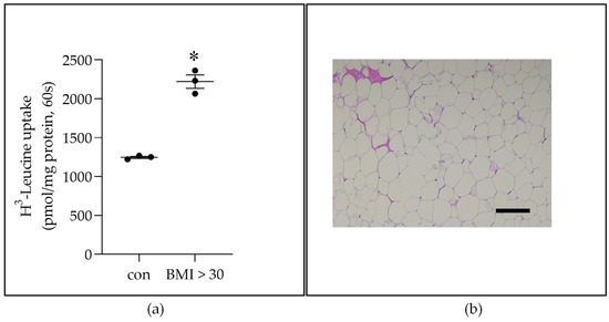 The effect of peritumor (PT) breast AT-derived secretome (PT-ADS) from women with BMIs > 30 on LAT1 activity in ER-positive ZR-75-1 cells. (a) Breast AT was obtained from women with breast cancer. Pieces of breast AT were cultured for 24 h. After culture, the media were collected and centrifuged to remove tissue debris. The cleared media, which is PT-ADS, were diluted 1:10 in media with 0.1% FBS and placed on ER-positive ZR-75-1 cells for 24 h (two times at 12 h intervals) for 3H-Leucine uptake analysis. The asterisk (*, p < 0.05) indicates a significant, based on Student’s t-test analysis, increase in 3H-Leucine uptake in response to PT-ADS from women with BMI’s > 30 compared with base-level uptake by control (con) ZR-75-1 cells. The data are shown as the mean ± SEM (n = 3). (b) H&E stain showing adipocytes in breast AT used to generate PT-ADS (magnification 100×). Scale bar is 100 µm.