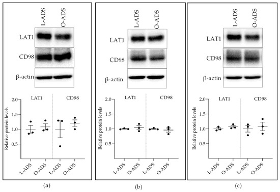 The effect of lean (L)- and obese (O)-ADS on LAT1 and CD98 protein expression. The method by which mouse AT-derived secretome (ADS) was isolated and placed on ER-positive BC cells for Western blot analysis is indicated in the legend of Figure 1. Relative protein levels of LAT1 and CD98 were calculated as the densitometric signal for LAT1 and CD98 divided by the densitometric signal for β-actin loading control. Statistical analysis, based on Student’s t-test analysis, showed that the levels of LAT1 and CD98 were not changed in response to O-ADS compared with L-ADS in: (a) MCF7; (b) T47D; and (c) ZR-75-1 cells. The data are shown as the mean ± SEM (error bars) for three experiments (n = 3).