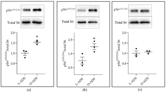 The effect of lean (L)- and obese (O)-ADS on mTOR signaling in: (a) MCF7; (b) T47D; and (c) ZR-75-1 cells. The method by which mouse AT-derived secretome (ADS) was isolated and placed on ER-positive BC cells for Western blot analysis is indicated in the legend of Figure 1. * Indicates a significant (p < 0.05) increase in phosphorylated ribosomal S6 protein on serine 235/236 (pS6235/236) in response to O-ADS compared with L-ADS, as analyzed by Student’s t-test (n = 3). All data represent mean ± S.E.